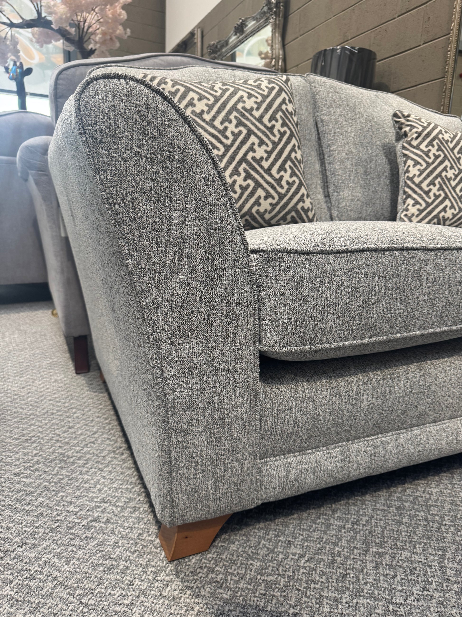 The Lottie Suite Is A Very minimalistic & Simple Handcrafted sofa with beautiful Trellis Grey Fabric.